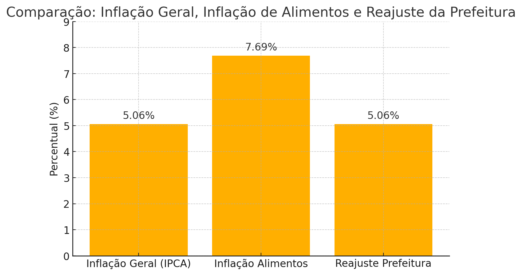 O reajuste de 5,06% não é um aumento, apenas uma correção da inflação. Como a inflação dos alimentos foi de 7,69%, os servidores municipais enfrentarão mais dificuldades para equilibrar suas despesas, já que os preços dos produtos básicos estão aumentando mais rápido do que os salários. Apesar de anunciada como uma “valorização”, a medida não garante ganho real e reduz o poder de compra dos servidores, principalmente nos itens de primeira necessidade. Para os trabalhadores, o reajuste abaixo da inflação significa menos comida na mesa e um orçamento cada vez mais apertado.